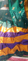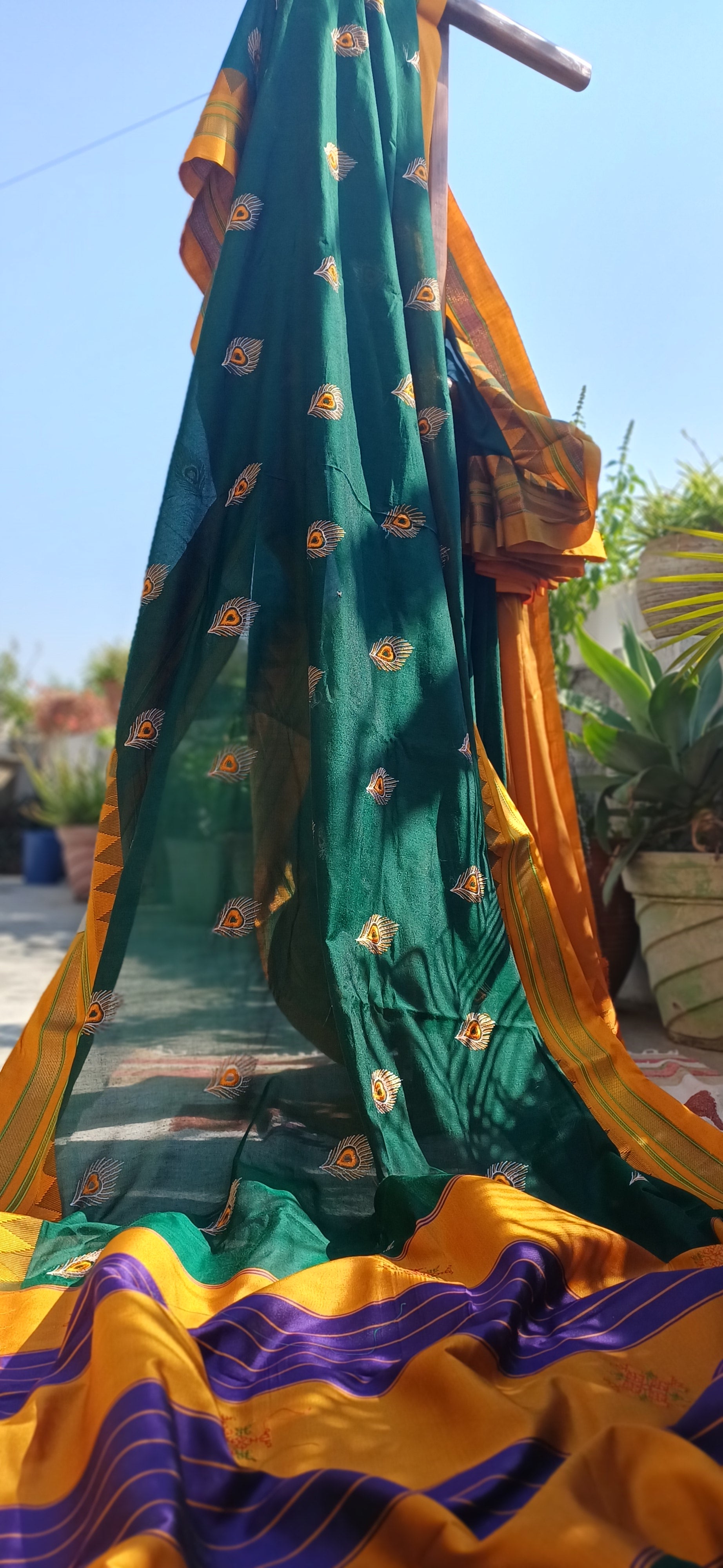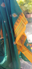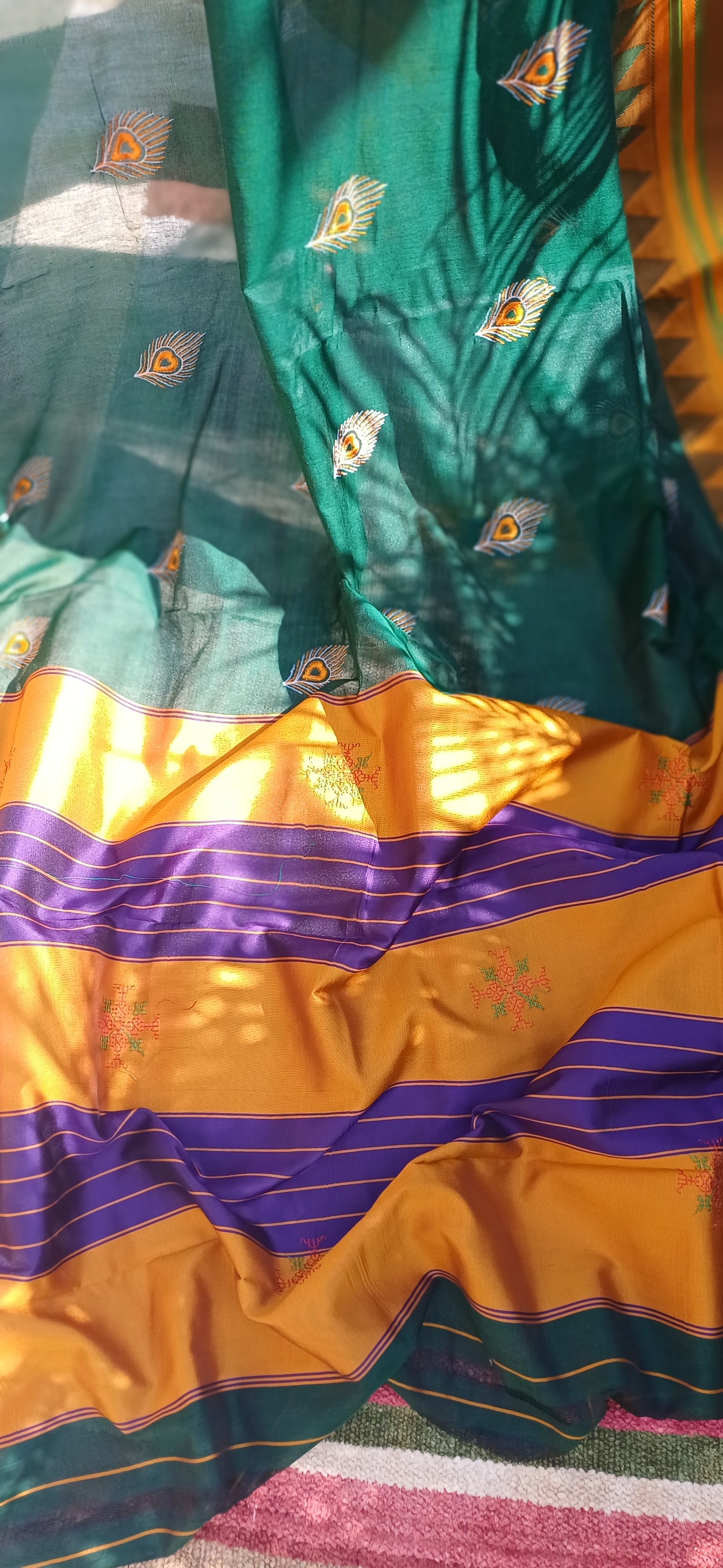 This exquisite cotton saree features a distinctive Ilkal border in vibrant green, complemented by intricate Kasuti embroidery beautifully depicting peacock feather motifs. Handcrafted in Karnataka, it combines traditional artistry with breathable cotton fabric, offering both elegance and comfort for special occasions and everyday wear.