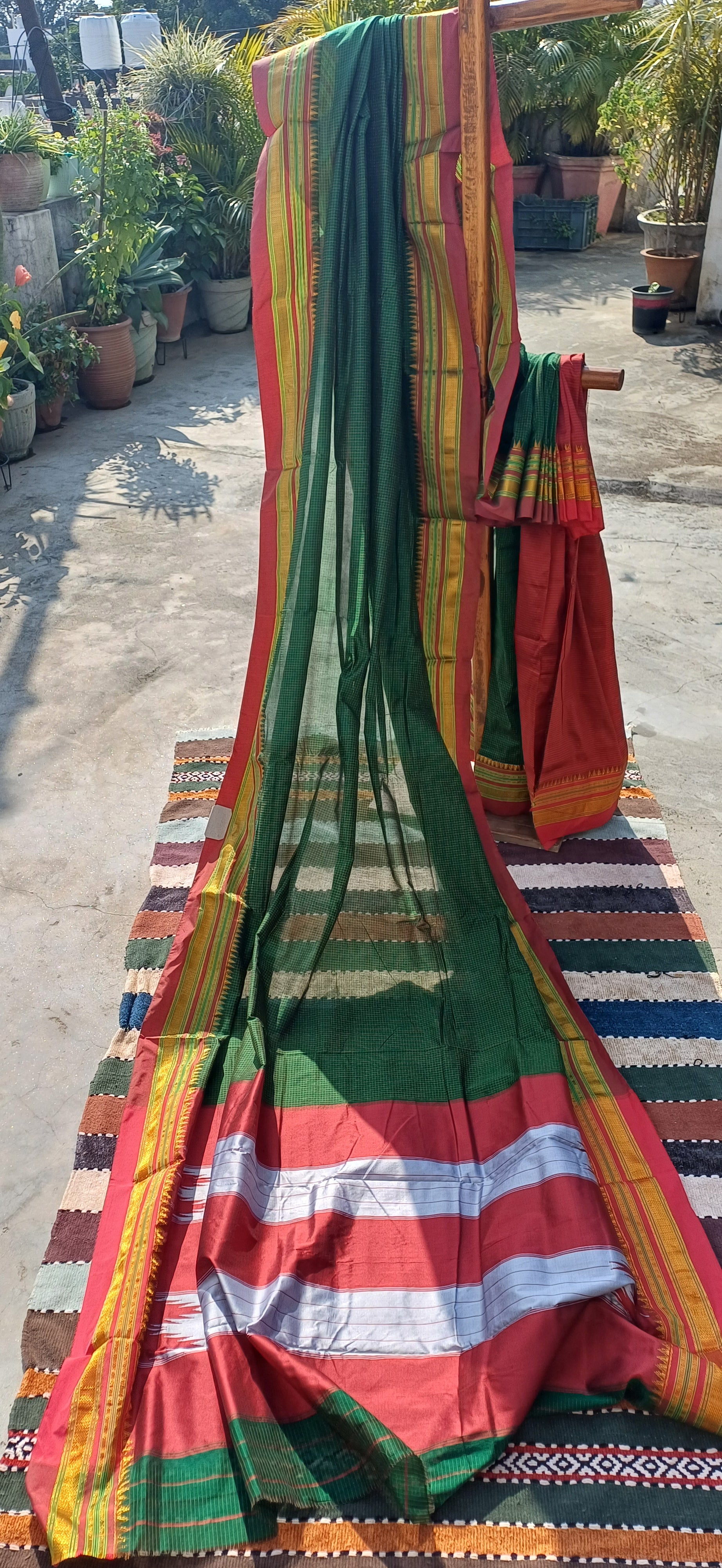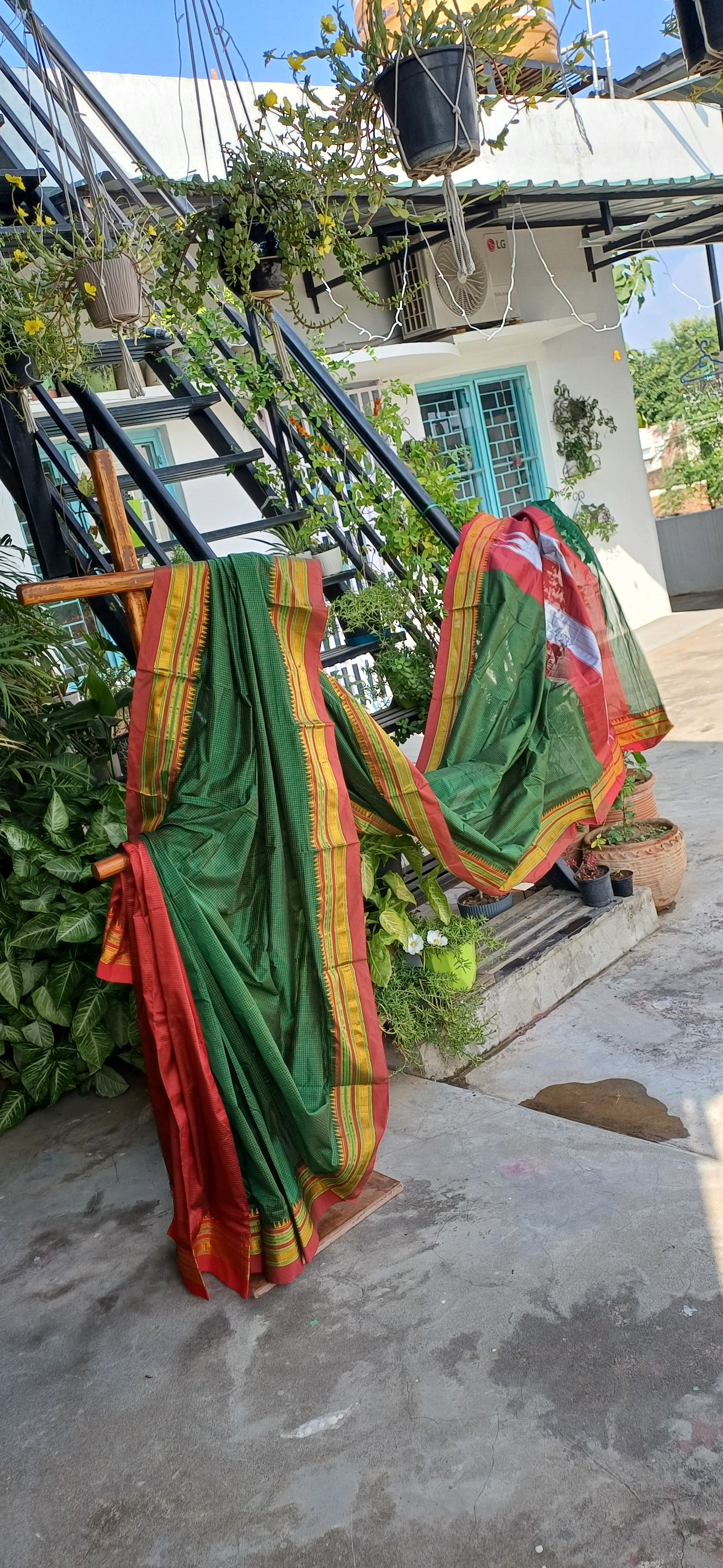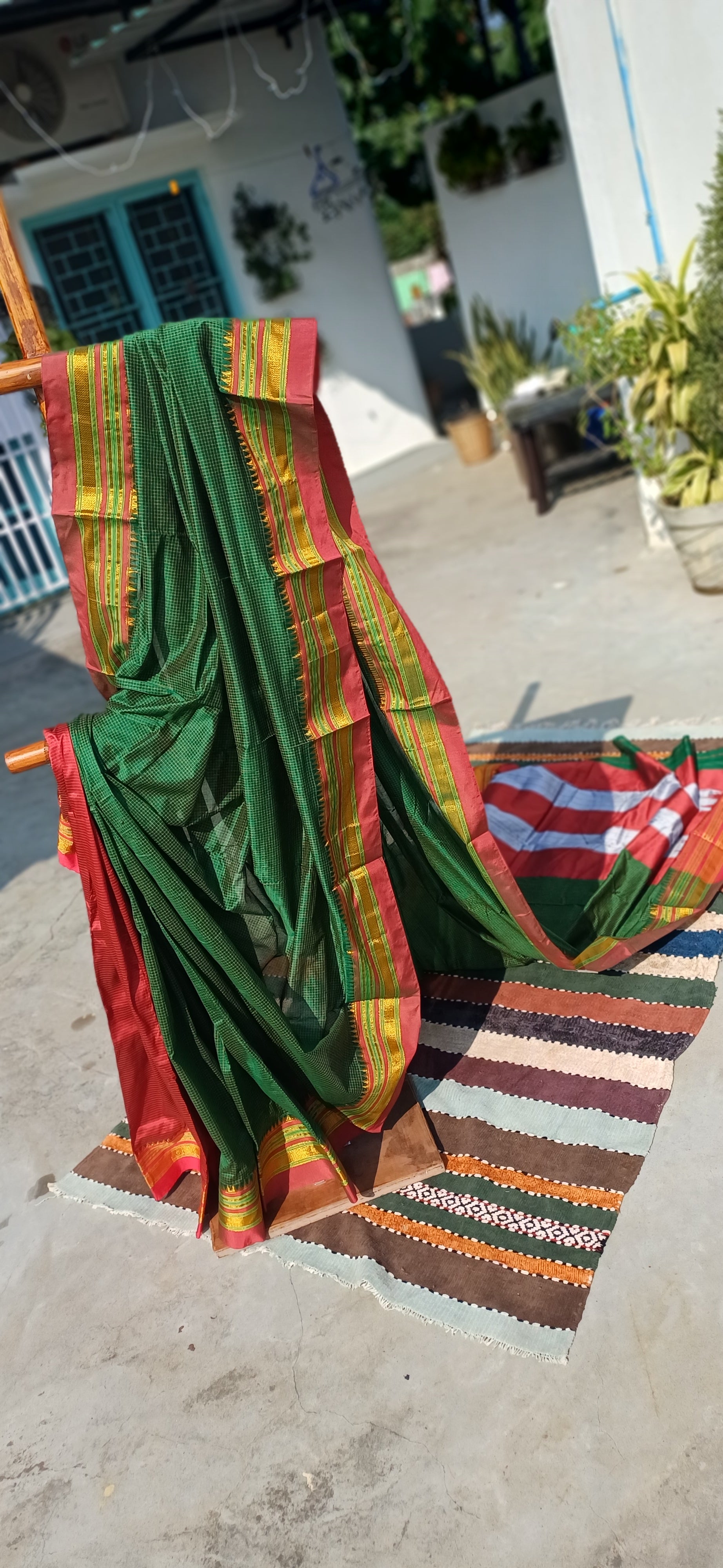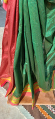 Cotton Saree- Green Body with Red & Yellow Ilkal Border